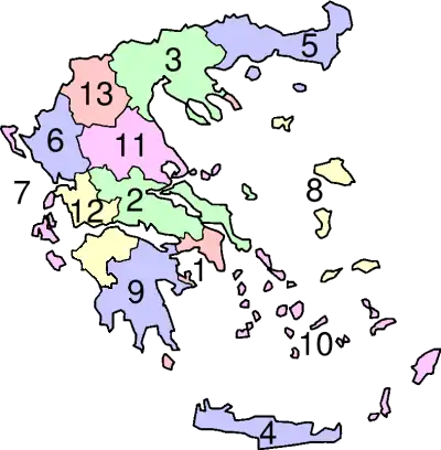 As regiões modernas (em grego: περιφέρειες; περιφέρεια, no singular; romaniz.: periferia), também traduzidas como "periferias", são as divisões administrativas de primeiro nível da Grécia. Existem 13 regiões (nove no continente e quatro grupos de ilhas), que são ainda subdivididas em 54 unidades regionais (também traduzidas por "unidades periféricas"; por vezes chamadas prefeituras, embora esse termo já não exista oficialmente):