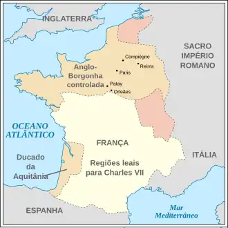 Após várias conquistas inglesas, especialmente no começo do século XV, o tratado de Troyes (1420) garantia a Inglaterra todo o norte do país (inclusive Paris) e forçou Carlos VI a deserdar do trono seu filho, o delfim Carlos (futuro Carlos VII). Henrique V casou-se com a princesa Catarina, filha de Carlos VI, ficando com o direito de herdar o trono.
