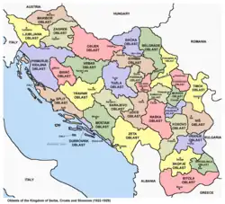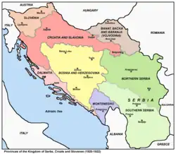 As subdivisões do Reino da Iugoslávia existiram sucessivamente em três formas diferentes. De 1918 a 1922, o reino manteve as subdivisões anteriores à Primeira Guerra Mundial dos estados predecessores da Iugoslávia. Em 1922, o estado foi dividido em trinta e três oblasts (províncias). Em 1929, após o estabelecimento da Ditadura de 6 de janeiro, um novo sistema de nove banovinas (regiões) foi implementado por decreto real. Em 1939, como acomodação para os croatas iugoslavos no Acordo Cvetković-Maček, uma única Banovina da Croácia foi formada a partir de duas dessas banovinas (e de seções de outras).[61][62]