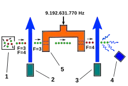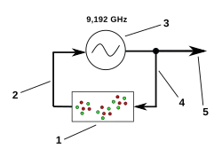 O princípio de funcionamento de um relógio atômico de césio está baseado na estabilização da frequência de um oscilador local nessa frequência, vide figura 1.[1][5]