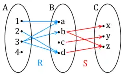 Tomemos como exemplo os conjuntos A = {1,2,3,4}, B = {a,b,c,d} e C = {x, y, z} e as relações R = {(1, a), (2, d), (3, a), (3, b), (3, d)} de A para B e S = {(b, x), (b,z), (c, y), (d,z)} de B para C. A composição de R e S será, com o auxílio do diagrama de setas (ver figura 2) RS = {(3, x), (3,z), (2,z)}.