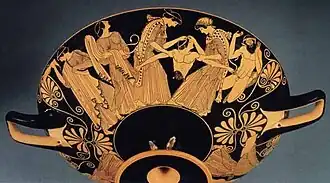 As grandes Dionísias incluíam: uma procissão, sacrifícios — cultos — e essencialmente as representações dramáticas chamadas de tragédias gregas. As tragédias eram representações artísticas, também consideradas instituição social.[106] Faziam parte da trama a aristocracia grega e os deuses, que eram divididas em dois ambientes: no palco, atores representando os heróis falavam na forma de prosa e, no coro, um colégio de cidadãos narravam à história contada.[110] A procissão iniciava em um templo onde uma antiga estátua de madeira de Dioniso era carregada até o teatro. Nos cultos incluíam: derramamento de alimentos, vinho, água lustral, mel e Leite. Esses derramamentos religiosos são chamados de libações. Os cultos que envolvem as crenças gregas antigas aconteciam em lugares considerados especiais, tais como bosques sagrados, templos e montanhas. Esses cultos aconteciam em dias comemorativos atenienses, como nas Dionisias, em casamentos e em nascimentos. Realizavam-se durante todo o ano, em vários eventos e oportunidades, pois era uma prática comum, assim como são, nos dias de hoje, algumas práticas cerimoniais de diferentes religiões.[111]