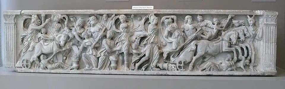 Relevo de sarcófago mostrando as musas ao lado do poeta