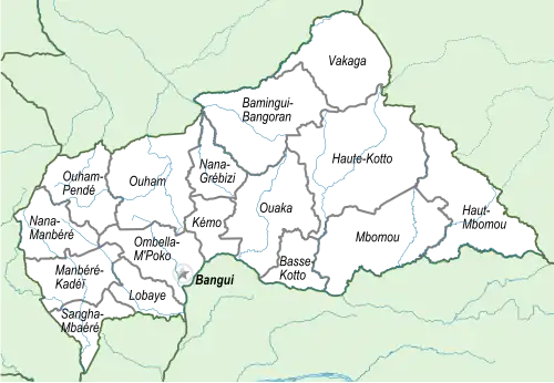 A República Centro-Africana divide-se em 14 prefeituras administrativas, 2 prefeituras econômicas e 1 comuna autônoma. As 14 prefeituras são: