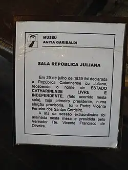 - ↑ Becker, Marcelo. (10 de junho de 2008). «Laguna revive proclamação da República Juliana». Diário Catarinense. Consultado em 17 de janeiro de 2009