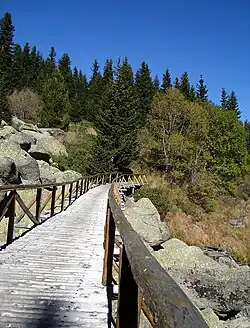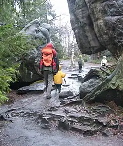 Caminho no Szczeliniec Wielki, uma famosa reserva natural nos Montes Tabulares, no sudoeste da Polônia