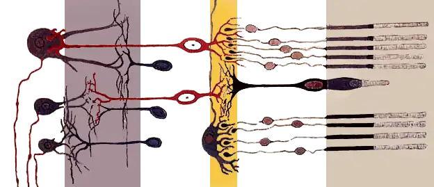 Como as células horizontais têm uma resposta relativamente lenta, quando um fotorreceptor detecta um objecto em movimento, elas ainda têm informação sobre a situação anterior; e isso faz com que o sinal de saída das células bipolares, que passa depois através da camada das células amacrinas (camada a violeta na figura) para as células ganglionares, contenha informação útil para a detecção de movimento.