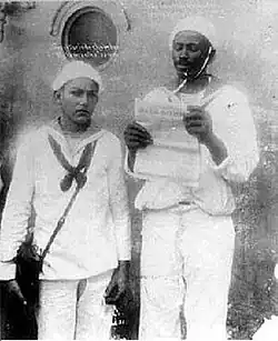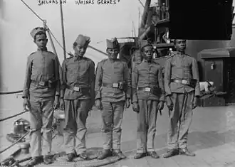 ![]() O líder da Revolta da Chibata, João Cândido (primeira fileira, à esquerda do homem de terno escuro), com repórteres, oficiais e marinheiros a bordo do Minas Geraes em 26 de novembro de 1910. | |||
