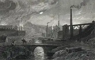![]() Uma cena industrial mostrando siderurgia em Nantyglo, Blaenau Gwent, Grã-Bretanha, na década de 1830. A fumaça pode ser vista saindo de várias chaminés e uma ponte está no centro. | |||