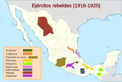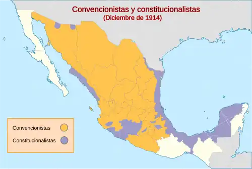 Depois deste acontecimento aprofundaram-se as diferenças entre as facções que haviam lutado contra Huerta, o que desencadeou novos conflitos. Carranza, chefe da Revolução de acordo com o Plano de Guadalupe, convocou todas as forças à Convenção de Aguascalientes para nomearem um líder único. Nessa reunião Eulalio Gutiérrez foi designado presidente do país, mas as hostilidades reiniciaram-se quando Carranza rejeitou o acordo. Depois de derrotarem a Convenção, os constitucionalistas puderam iniciar os trabalhos de redação de uma nova constituição e conduzir Carranza à presidência em 1917. A luta entre facções estava longe de terminar. Durante o reajustamento das forças foram assassinados os principais chefes revolucionários: Zapata em 1919, Carranza em 1920, Villa em 1923 e Obregón em 1928.