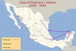 Madero realizou três excursões para promover clubes antirreeleicionistas estaduais com vista a celebrar uma convenção anual em abril de 1910, na qual se constituiria o Partido Nacional Antirreeleicionista e se designariam os candidatos para as próximas eleições.[43] Madero foi detido por ordem do juiz de distrito de San Luis Potosí enquanto estava em Monterrey,[44] acusado de incitar à rebelião,[45] pelo que foi trasladado e confinado na prisão do estado. Quarenta e cinco dias depois foi posto em liberdade sob fiança, ainda que sem a possibilidade de sair do estado. Durante este mesmo período realizaram-se as eleições presidenciais.[44]