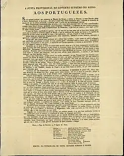 A reunião resultou no "Manifesto aos Portugueses", proclamação na qual, depois de traçado o cenário de um país desolado e de glorificado o Exército, dava-se a conhecer à nação os objetivos do movimento, declarava-se fidelidade e vassalagem ao rei D. João VI, à Monarquia e à Casa de Bragança, e garantia-se a manutenção da ordem, assim como o respeito pela religião católica. O tom era bastante moderado, até algo conservador: "As leis do Reino, observadas religiosamente, segurarão a propriedade individual, e a Nação sustentará a cada um no pacífico gozo de seus direitos, porque ela não quer destruir, quer conservar. As mesmas ordens, os mesmos lugares, os mesmos ofícios, o sacerdócio, a magistratura, todos serão respeitados no livre exercício da autoridade que se acha depositada nas suas mãos". O fim último da Junta seria "convocar Cortes representativas da Nação, e nelas formar uma Constituição adequada à nossa santa religião, aos nossos bons usos, e às leis que na atualidade das coisas nos convêm".[1]