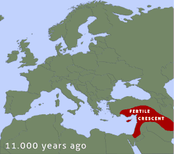 O começo deste processo em diferentes regiões foi datado entre 10 000 a 8 000 a.C. no Crescente Fértil[56][57] e talvez 8 000 a.C. no Antiga Área Agrícola de Kuk, na Melanésia.[58][59] Essa transição em toda parte parece associada a uma mudança de um modo de vida caçador-coletor em grande parte nômade para um mais assentado, baseado na agricultura, com o início da domesticação de várias espécies de plantas e animais - dependendo da espécie disponível localmente e provavelmente também influenciado pela cultura local. Pesquisas arqueológicas recentes sugerem que em algumas regiões, como a península do Sudeste Asiático, a transição de caçador-coletor para agricultor não era linear, mas específica para cada região.[60]
