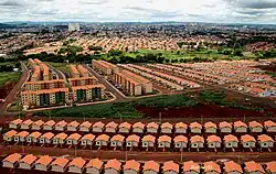 Em meados da década de 1930 foi construído o Edifício Diederichsen, o primeiro edifício da cidade e considerado por alguns historiadores o primeiro prédio multiuso do estado de São Paulo.[57] Nas décadas de 1940 e 1950 começam a chegar as rodovias e melhorias estruturais, tais como investimentos em faculdades e universidades, assim como uma intensificação do processo de industrialização do município.[58] O crescimento econômico desse período ampliou cada vez mais os limites urbanos de Ribeirão Preto, gerando um crescente déficit de moradias. A partir da década de 1960, moradias de baixa renda começaram a ser construídas em bairros como os Jardins Zara, Novo Mundo, Anhanguera, Grajaúna e Progresso, geralmente financiados pelo Banco Nacional de Habitação (BNH). Oficializados pelo poder público local, esses bairros surgiram também a partir do loteamento de antigas propriedades rurais no entorno da mancha urbana crescente de Ribeirão Preto, quase sempre com grandes carências de infraestrutura.[59]