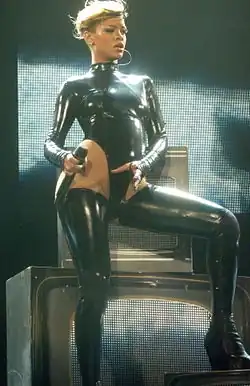 Para o site de notícias Canadian Online Explorer, Denis Armstrong, descreveu sua apresentação no palco do festival Ottawa Bluesfest, dizendo que "seu show era uma fantasia coreografada ao estilo da Disney, contendo uma atitude atrevida, atrativos pessoais e uma série de sucessos descolados e sem açúcar".[259] De acordo com uma pesquisa feita pela revista Billboard, sua performance de "Disturbia" realizada na edição de 2008 do Prêmio de Música da MTV foi considerada a décima melhor apresentação da cerimônia.[260] Suas roupas de couro sensuais trajadas durante sua turnê Good Girl Gone Bad Tour, foram altamente criticadas pelo partido conservador islâmico da Malásia, que recomendou que a digressão fosse proibida do pais.[261] Enquanto comentava a turnê de acompanhamento do terceiro álbum da cantora, o jornal britânico The Times comparou o estilo de figurino usado por Rihanna aos de Janet Jackson e a chamou de "uma visão da alta costura, em botas até a coxa e alguns restos de PVC preto".[262] Para a edição britânica da revista Vogue lançada em outubro de 2011, a cantora disse que suas roupas e performances em apresentações são todos uma grande atuação; "Não sou eu. Essa é uma parte que eu interpreto. Você sabe, como se fosse uma obra de arte, com todos esses trajes e texturas para representar".[191]