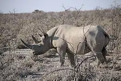Adultos da espécie pesam entre 800 e 1 400 kg, medindo até 1,8 m à altura da cernelha. Fêmeas menores que os machos. Apresentam dois cornos, sendo que o corno frontal tem até 50 cm de comprimento. Diferencia-se do rinoceronte-branco pelo tamanho menor e pelo lábio superior preênsil, devido a hábitos alimentares de um pastador-podador. Quatro subespécies descritas. D. b. longipes está considerada extinta desde 2006 e ocorria nas savanas do centro-oeste da África, sendo que a última população conhecida ocorria no norte de Camarões. As outras três subespécies ainda ocorrem na natureza e são categorizadas como criticamente em perigo: D. b. bicornis, com 1 920 indivíduos vivendo na Namíbia e África do Sul; D. b. michaeli, com 740 indivíduos vivendo principalmente no Quênia; e D. b. minor, com 2 220 indivíduos vivendo principalmente na África do Sul, Zimbábue e pequenas populações na Tanzânia.[5] | |