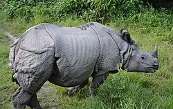 Maior espécie de rinoceronte que ocorre na Ásia, pesa até 2 000 kg, medindo até 3,8 m de comprimento e 1,86 à altura da cernelha. Machos são maiores que as fêmeas. Possui apenas um corno, como o rinoceronte-de-java, que mede até 25 cm de comprimento. Já foi amplamente distribuído no subcontinente indiano, atualmente só ocorre em populações isoladas e pequenas no norte da Índia (em 2013 cerca de 4 000 indivíduos) e Nepal (378 indivíduos), sendo encontrado e muitas unidades de conservação nessas regiões.[8] |