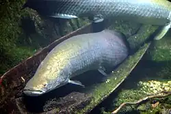 A ictiofauna amazônica é o centro de diversidade dos peixes neotropicais, alguns dos quais são espécimes populares em aquários, como o néon e o acará. Mais de 5,6 mil espécies eram conhecidas em 2011, e aproximadamente cinquenta novas espécies são descobertas a cada ano.[53][54] O pirarucu é um peixe tropical de água doce da América do Sul, um dos maiores peixes de água doce do mundo, com comprimento de até 4,6 m.[43] Outro peixe de água doce da Amazônia é o aruanã, um predador e muito parecido com o pirarucu, mas que atinge apenas 120 cm de comprimento. Também está presente em grande número a notória piranha, um peixe onívoro que se reúne em grandes cardumes e pode atacar até o gado. Existem aproximadamente 30 a 60 espécies de piranhas. O candirú, nativo do rio Amazonas, é uma espécie de bagre parasita de água doce da família Trichomycteridae,[55] apenas uma das mais de 1,2 mil espécies de bagres da bacia amazônica. Outros bagres 'caminham' por terra em suas extremidades ventrais,[56] enquanto a piraíba (Brachyplatystoma filamentosum) pode atingir 3,6 metros de comprimento e 200 quilos de peso.[57]