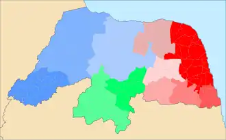 Mais de 85% do território do Rio Grande do Norte é dividido em um conjunto de quatorze bacias hidrográficas: Apodi-Mossoró, Boqueirão, Catu, Ceará-Mirim, Curimataú, Doce, Guaju, Jacu, Maxaranguape, Piranhas-Açu, Potengi, Pirangi, Punaú e Trairi.[77] Outros 10,8% estão na faixa litorânea norte de escoamento difuso[78] e 1,2% na faixa leste,[79] ambas constituídas por pequenos cursos d'água que fluem diretamente para o oceano, sem uma área delimitada pelos divisores de águas.[80] Em âmbito nacional, o Rio Grande do Norte encontra-se totalmente inserido na região hidrográfica do Atlântico Nordeste Oriental.[81]
