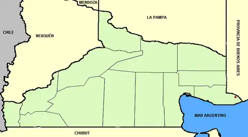 Esta província limita-se a leste com a Província de Buenos Aires e Oceano Atlântico, ao norte com La Pampa, ao sul com Chubut e a oeste com Neuquén e o Chile.