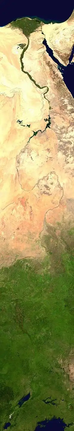 O Nilo é um rio do continente africano, considerado o segundo mais extenso curso d'água do mundo.[nota 1][nota 2] Situado no nordeste do continente africano, sua nascente está a sul da linha do Equador e sua foz ocorre no mar Mediterrâneo. Ele segue essa trajetória há 30 milhões de anos.[8]