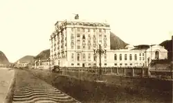 Em 13 de agosto de 1923, é inaugurado o Copacabana Palace que, projetado pelo arquiteto italiano Joseph Gire,[38] consagrou definitivamente o turismo na zona sul, que experimentaria uma explosão demográfica. Em 1926 a cidade ganha o hipódromo da Gávea.[39] Em 1927, a prefeitura do Rio de Janeiro contrata o arquiteto francês Alfred Agache, responsável por elaborar o Plano de Extensão, Remodelação e Embelezamento do Rio de Janeiro, apresentado em 1930.[24][40] Antes, em 1929, surge o primeiro arranha-céu do Brasil, o Edifício Joseph Gire, sede do jornal A Noite que, com 22 andares e 102 metros de altura,[41] foi o prédio mais alto da América Latina até 1934.[24] O Cristo Redentor seria inaugurado em 1931, tornando-se um dos cartões-postais da cidade e do país.[42] Em 1932, ocorreu o primeiro desfile das escolas de samba do Rio de Janeiro, na Praça Onze.[43]