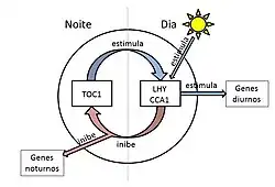 Em plantas, os ritmos circadianos são gerados por um mecanismo molecular dentro de suas células. O mecanismo apresenta uma periodicidade auto-sustentada e é responsivo à luz. Estudos em plantas do gênero Arabidopsis demonstraram que ao amanhecer a luz ativa a expressão gênica das proteínas LHY e CCA1, que por sua vez estimulam genes que se expressam durante o dia. Entretanto, essas proteínas também inibem genes que se expressam durante a noite, como TOC1. Ao entardecer, os níveis de LHY e CCA1 diminuem, permitindo a elevação da proteína TOC1, que por sua vez aumenta os níveis dos genes LHY e CCA1 durante a noite, reiniciando o ciclo ao amanhecer.[11]