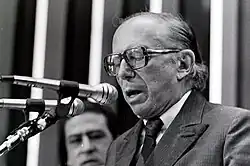 Roberto de Oliveira Campos ABL (Cuiabá, 17 de abril de 1917 – Rio de Janeiro, 9 de outubro de 2001) foi um economista, professor, escritor, diplomata e político brasileiro. Nascido em Mato Grosso, oriundo de uma família de origem humilde, formou-se em Filosofia e Teologia em um seminário católico, seguindo a carreira diplomática após passar no concurso do Itamaraty.[1] Foi nomeado cônsul de terceira classe em Washington D.C., e, nesta cidade, se formou em Economia pela Universidade George Washington. Pouco tempo depois, foi promovido a cônsul de segunda classe, e foi designado segundo secretário de Washington. Fez parte da delegação brasileira da Conferência de Bretton Woods, que criou o Fundo Monetário Internacional e o Banco Mundial. Após isso, juntou-se à representação do Brasil nas Nações Unidas em Nova Iorque, onde fez a sua Pós-Graduação em Economia pela Universidade Columbia. No período em que permaneceu nos Estados Unidos, foi membro da delegação brasileira em diversas reuniões e conferências internacionais.[2]