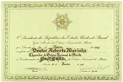 - ↑ Linha do Tempo - 1961 - Grã-Cruz da Ordem Nacional do Mérito, concedida pela Presidência da República. Recebeu o grau de Chanceler em 30/06/1960 e de Grão-Mestre em 29/01/1960. www.robertomarinho.com.br. Página acessada em 22 de fevereiro de 2018.
