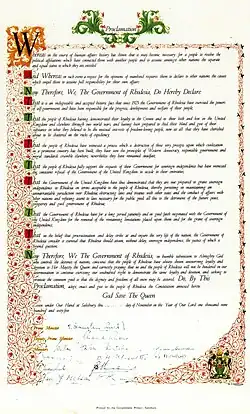 Durante uma tentativa de atrasar uma transição imediata ao governo africano nativo, o governo da Rodésia emitiu sua própria Declaração Unilateral de Independência do Reino Unido em 11 de novembro de 1965.[3] Os colonos brancos (que constituíam 5% da população), liderados desde 1964 pelo primeiro-ministro Ian Smith da Frente Rodesiana, temerosos com a possibilidade de Londres conceder plenos direitos para a população negra da colônia, declararam unilateralmente a independência e estabeleceram um regime racista assemelhado ao apartheid da União Sul-Africana.[4] A administração inicialmente buscou o reconhecimento como um reino autônomo dentro da Comunidade das Nações, mas o próprio foi reconstituído como uma república em 1970.[5]