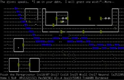 - O jogo tem um grau de complexidade devido à variedade de sistemas, permitindo ao jogador alcançar objetivos de diferentes formas, criando jogabilidade emergente.[18][22] Por exemplo, para atravessar uma porta trancada, o jogador pode tentar arrombá-la, chutá-la, incendiá-la ou cavar ao redor, dependendo da situação e do inventário. Uma frase comum associada a NetHack é "A equipe de desenvolvimento pensou em tudo", refletindo as inúmeras combinações possíveis de ações antecipadas pelos desenvolvedores, como usar luvas para empunhar o corpo de um cocatriz e petrificar inimigos.[23]