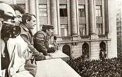 Após a revolução, a Frente de Salvação Nacional (FSN), conduzida por Ion Iliescu, fez reformas democráticas e econômicas parciais.[95][96] Em abril de 1990, um protesto que contestava os resultados das eleições e acusava a FSN, incluindo Iliescu, de ser composta por ex-comunistas e membros da Securitate, rapidamente cresceu para se tornar o que foi chamado de Golaniad. As manifestações pacíficas acabaram em violência, o que instigou a intervenção de mineiros de carvão convocados por Iliescu. Este episódio foi amplamente documentado por meios de comunicação locais[97] e estrangeiros.[98][99][100]