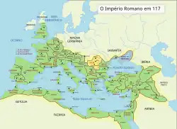 Incursões romanas durante o regime do imperador Trajano (r. 98–117), entre 101–102 e 105–106, tornaram metade do reino da Dácia uma província do Império Romano chamada Dácia Feliz. O domínio romano durou 165 anos. Durante este período, a província foi totalmente integrada ao restante do império e uma parte considerável da população era recém-chegada de outras províncias.[23] Os colonos romanos introduziram a língua latina na região. De acordo com os seguidores da teoria da continuidade, a romanização intensa da região teve como consequência o surgimento da língua protorromena.[24][25] A província era rica em depósitos de minério (principalmente ouro e prata em lugares como Alburnus Maior). As tropas romanas saíram da Dácia por volta do ano 271.[26][27] O território foi posteriormente invadido por vários povos migrantes.[28][29][30][31] Burebista (r. 82–44 a.C.), Decébalo (r. 87–106) e Trajano são considerados antepassados dos romenos na historiografia do país.[32][33][34]