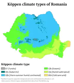Devido à distância do mar aberto e por sua localização na porção sudeste do continente europeu, a Romênia tem um clima temperado e continental, com quatro estações definidas. A temperatura média anual é de 11 °C no sul e 8 °C no norte.[115] No verão, as temperaturas máximas médias em Bucareste sobem para 28 °C e temperaturas acima de 35 °C são bastante comuns nas zonas mais baixas do país. No inverno, a temperatura máxima média é inferior a 2 °C. O nível de precipitação atinge 750 mm por ano apenas nas mais altas montanhas ocidentais, enquanto em Bucareste o índice cai para cerca de 600 mm.[114]