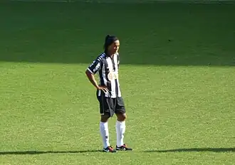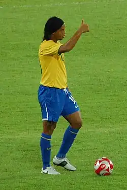 Ronaldo de Assis Moreira (Porto Alegre, 21 de março de 1980), mais conhecido como Ronaldinho Gaúcho, é um ex-futebolista brasileiro que atuava como meio-campista, segundo atacante ou ponta-esquerda. Amplamente reconhecido como um dos jogadores mais talentosos da história,[5][6] destacou-se pela extrema habilidade, pelos dribles memoráveis e pela técnica refinada. É considerado por muitos jornalistas e ex-atletas como o mais talentoso de sua geração. Especialista em bolas paradas, popularizou a cobrança de falta por baixo da barreira.[7] Além do desempenho técnico, ficou marcado pelo estilo alegre e carismático dentro de campo.[8][9]