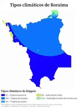 Apesar da latitude, no extremo noroeste e nordeste, nas áreas mais elevadas do estado, é possível encontrar padrões climáticos compatíveis com os de climas subtropicais úmidos (Cfa e Cwa),[31] como na região em torno do Monte Roraima, que apresenta temperatura média anual entre 20 e 22 °C,[32] e uma estação seca entre os meses de dezembro e março.[33][34]