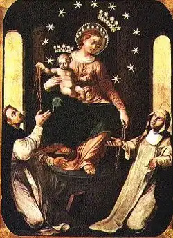 A tradição atribui a São Domingos de Gusmão a instituição do Rosário após uma visão da Virgem Maria. Historicamente, porém, a forma estruturada do Rosário com meditação dos “mistérios” não é corroborada por muitos historiadores, sendo motivo de grande polêmica no início do século XX, segundo Fermín Labarga.[9]