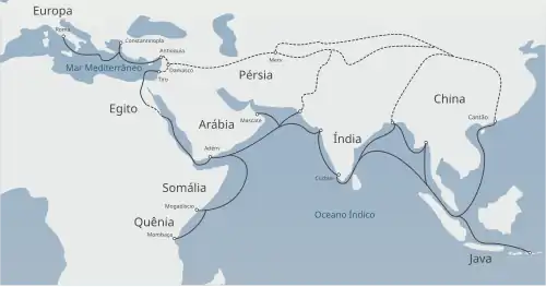 A rota da seda marítima foi aberta entre Jiaozhi (controlada pelos chineses, localizada no Vietnã moderno, próximo a Hanói) e os territórios nabateus na costa noroeste do Mar Vermelho. Provavelmente inaugurada no século I, estende-se pelo litoral da Índia e Sri Lanka e pelos portos controlados por Roma, entre eles os principais portos egípcios.