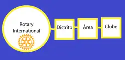 Entre o Rotary International e os mais de 35 000 Rotary Clubs[35] existem algumas instâncias. Os distritos são a última antes do Rotary International. Cada distrito é dividido em Áreas, que por sua vez são formadas por Rotary Clubs. Os distritos possuem sua governadoria, secretaria e tesouraria dentre algumas avenidas.[36] A administração interna dos Rotary Clubs se da por meio de cargos. O mais alto cargo é o de presidente, líder de uma comissão denominada mesa, que é composta, além do presidente, do secretário e do tesoureiro, assim como seus respectivos vices. Existem também avenidas de serviços, que podem individualmente se tornarem comissões. As avenidas de serviços variam de clube a clube, sendo as mais recorrentes, a de Imagem Pública, Finanças, Comunidades e Protocolo.[37]