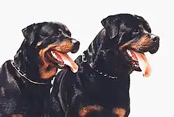 Rottweiler[Nota] (em alemão: Rottweiler Metzgerhund) é uma raça de cães molossos desenvolvida na Alemanha.[2] Criada por açougueiros da região de Rottweil para o trabalho com o gado, logo tornou-se um eficiente cão de guarda e boiadeiro, e cão de tração.[3] Devido à sua utilidade, tornou-se popular em todo o mundo ao decorrer do século XX. É uma raça descrita como de exemplares inteligentes, valentes e devotados.[2] Fisicamente é um animal forte, de pelagem preta e curta, com marcações em castanho; é robusto e de estrutura compacta, que transparece força, agilidade e resistência.[3]