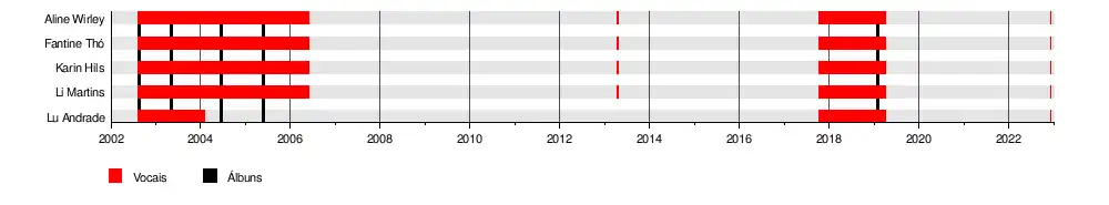 ![]() Rouge em 2018. Da esquerda para a direita: Aline Wirley, Li Martins, Karin Hils, Lu Andrade e Fantine Thó | |