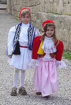 Duas crianças gregas, em roupas típicas.