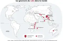 O rubi é minerado na África, Ásia e na Austrália. Eles são mais comuns em Myanmar, no Sri Lanka e na Tailândia, porém também são encontrados em Montana e na Carolina do Sul nos Estados Unidos e Moçambique em África. Algumas vezes ocorrem juntamente com espinelas nas mesmas formações geológicas ocorrendo confusão entre as duas espécies: no entanto, bons exemplares de espinelas vermelhas têm um valor próximo do rubi.