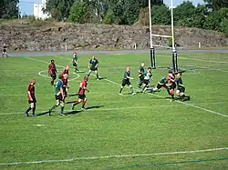 O rugby union (rúgbi union), comumente conhecido simplesmente como rugby, é um esporte de equipe de contato próximo que se originou na Rugby School na primeira metade do século XIX. O rúgbi se baseia simplesmente em correr com a bola na mão. Em sua forma mais comum, um jogo é disputado entre duas equipes de 15 jogadores cada, usando uma bola oval em um campo retangular chamado de campo. O campo tem traves de gol em forma de H em ambas as extremidades.