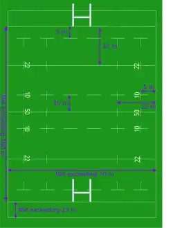 - Linhas de "5 metros": Linhas tracejadas de 5 metros no campo de jogo, paralelas a cada linha de gol. Os scrums não podem ser colocados mais perto de cada linha de gol do que essa linha, e os árbitros geralmente penalizam as infrações de scrum e ruck nessa área de forma mais severa, pois os times defensores geralmente ensaiam sufocar o jogo de ataque.