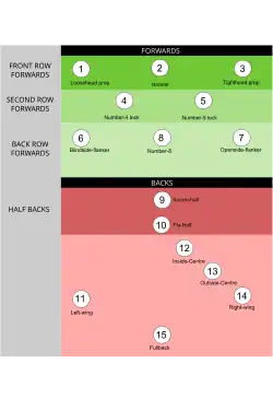 As principais responsabilidades dos jogadores avançados são ganhar e manter a posse da bola.[48] Os jogadores nessas posições geralmente são maiores e mais fortes e participam do scrum e do line-out.[48] Os atacantes costumam ser chamados coletivamente de "pack", especialmente quando estão na formação do scrum.[49]