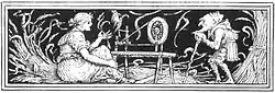 | A moça transforma palha em ouro ao lado de Rumpelstiltskin. - Ilustração por Walter Crane, 1886 | |