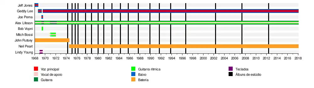 - Alex Lifeson - guitarra, violão, vocais de apoio. (agosto de 1968-2018)