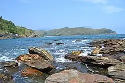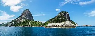 Duas das ilhas de São Sebastião vistas da BR-101. As Ilhas estão no meio, e a Ilha das Couves pode ser vista à direita, atrás d'As Ilhas