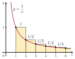 Na figura à direita, deslocar cada retângulo para a esquerda em 1 unidade produziria uma sequência de retângulos cujo limite se encontra abaixo da curva em vez de acima dela. Isso mostra que as somas parciais da série harmônica diferem da integral por uma quantia que é limitada superior e inferiormente pela área unitária do primeiro retângulo: